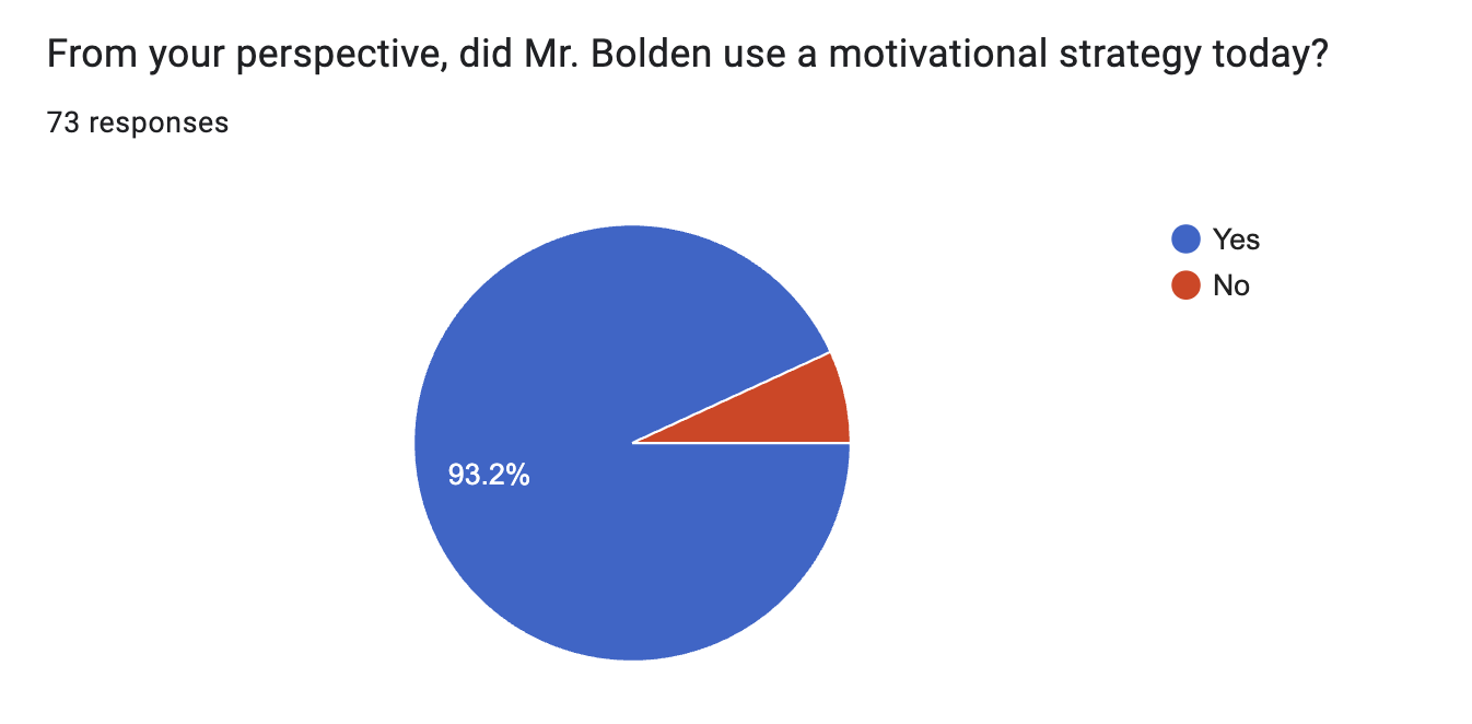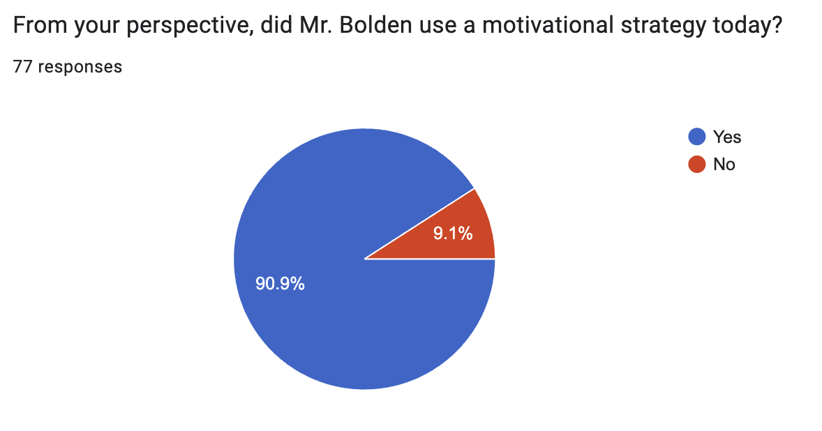 In response to the question, “From your perspective, did Mr. Bolden use a motivational strategy today?” 93.2% (68/73) of students responded “Yes” in week one (see Figure 3). The percentage of students who responded “Yes” dropped to 90.9% (70/77) in week two (see Figure 4).